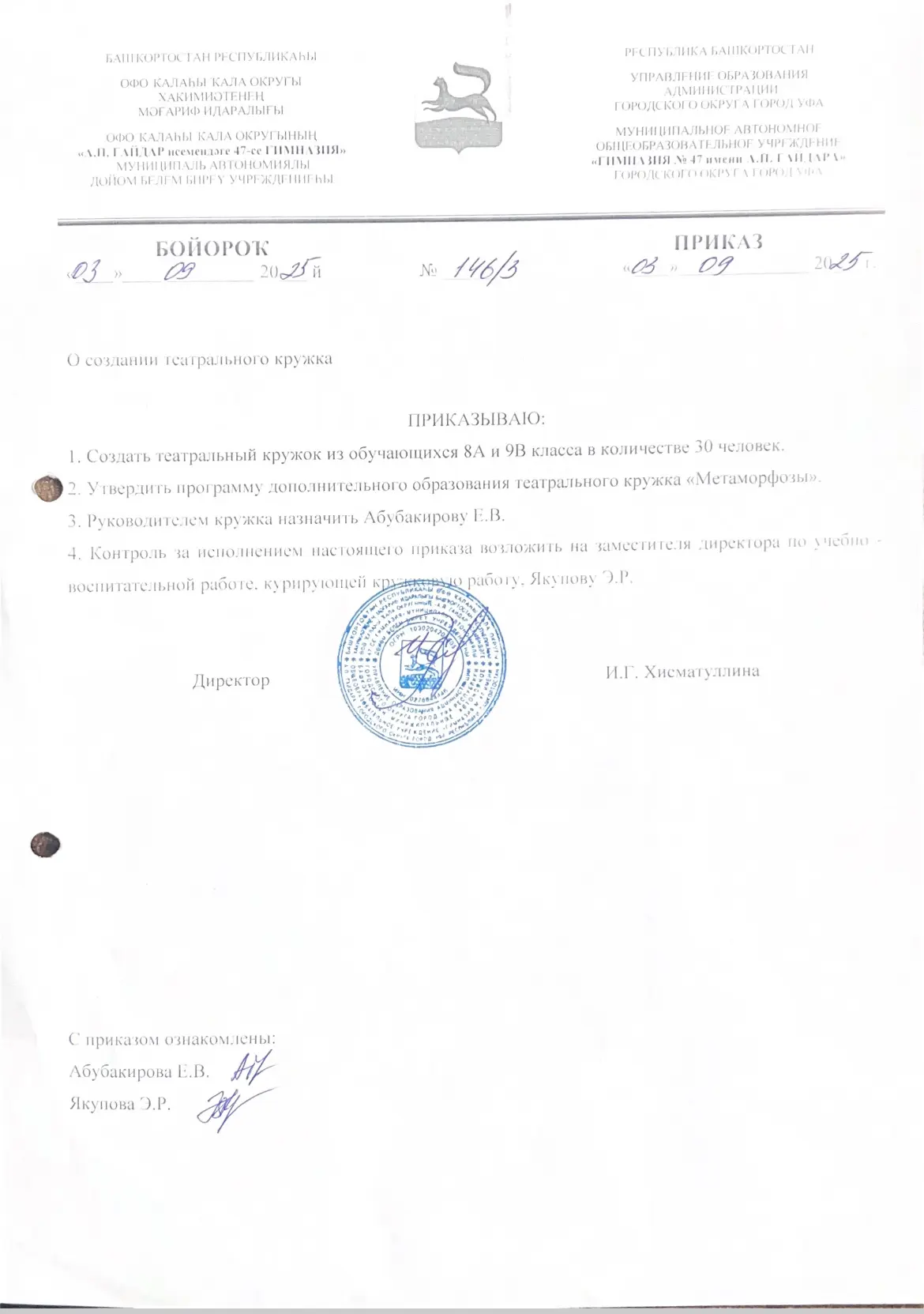 Приказ № 146/3 от 03.09.2025 "О создание театрального кружка"